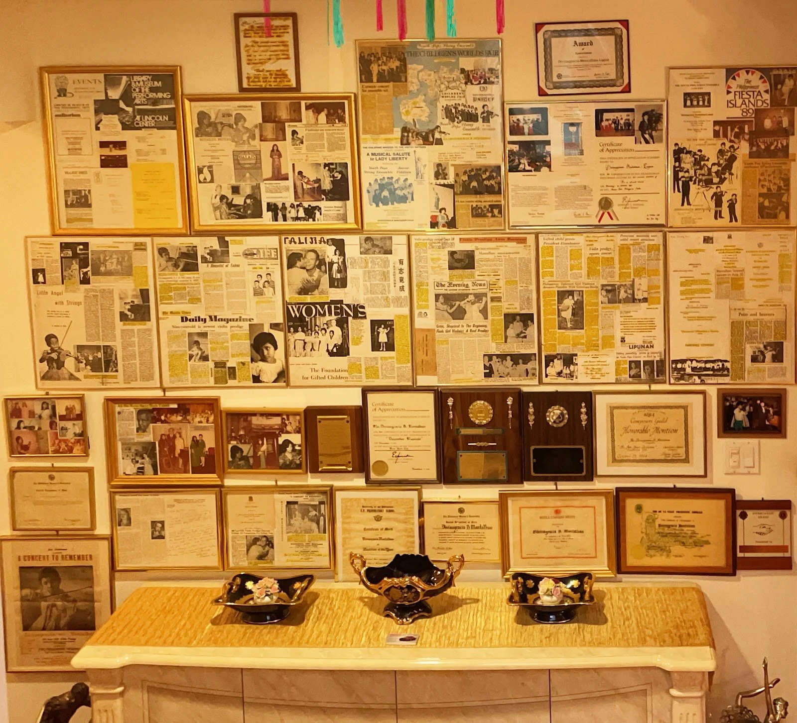 One of three awards-display walls (which also feature newspaper clippings) in her private residence is a partial testament to the multi-talents and blessings bestowed on Filipino-American concert artist-music director-arranger-choral conductor-mentor- songwriter, DIVINAGRACIA B. MONTALBAN-LAGUA.